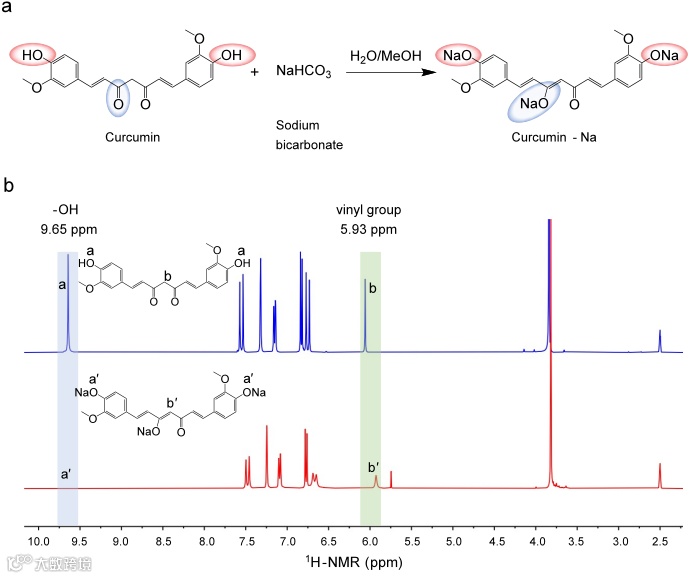 图1. 姜黄钠的合成。a. 用姜黄素和碳酸氢钠合成姜黄素钠(Cur-Na)的过程。姜黄素分子中酚羟基的H+被Na+取代(红色椭圆),而姜黄素中的羰基键发生酮-烯醇互变异构(蓝色椭圆)。b. 姜黄素和Cur-Na的1H-NMR光谱,显示了合成过程中发生的化学性质的代表性变化。蓝色阴影区域表示酚羟基的特征共振(δ=9.65ppm)。绿色阴影是烯烃信号(δ=5.93ppm),表明C=C双键的形成。