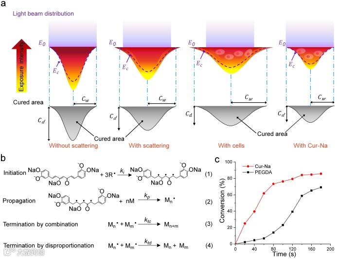 图3. Cur-Na抑制散射效应的机制。a. 示意图显示了当光穿透生物墨水时光强的高斯分布以及不同情况下产生的固化区域,包括无散射、有散射、与细胞混合的生物墨水和添加Cur-Na的生物墨水。Cd和Cw分别是固化深度和固化宽度。E0表示生物墨水表面的光强度,而EC是引发聚合所需的临界能量。b. Cur-Na自由基链生长聚合的动力学过程由三个阶段控制:(1)引发、(2)链传播、(3)(4)终止。ki,kp,ktc和ktd分别是四种反应中的速率常数。每个Cur-Na与三个自由基(R·)反应,引发聚合物链生长,形成单体(M)。激活后的单体可以与其他单体反应,聚合物链通过传播而增长,形成Mn·和Mm·。当链传播通过终止反应终止时,形成聚合物(Mn和Mm)。c. Cur-Na和PEGDA聚合过程中官能团的转化率与时间的关系。散射区域的自由基可以被Cur-Na快速消耗;水凝胶单体由于缺乏自由基而难以在散射区域形成聚合物。