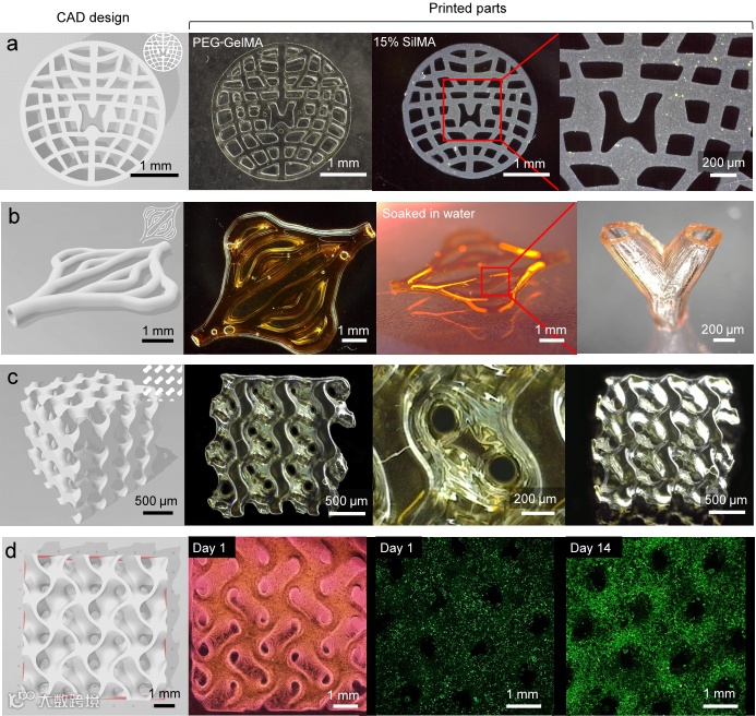 图6. Cur-Na在打印生物医学应用中常用的复杂三维结构时的分辨率和高保真度。a. 脊髓支架。它的结构特点呈现不规则的通道和薄壁网络,模仿脊髓的内部结构。使用两种类型的水凝胶成功地制备了支架:PEG-GelMA(10%)和甲基丙烯酸缩水甘油酯改性的丝素蛋白(Sil-MA(15%))。b. 具有多个分支、可灌注通道(200-800μm)和薄壁(~100μm)的血管网络。通过注射有色染料溶液进行灌注。c. 具有独特拓扑特征(曲面、高孔隙率和连通性)的gyroid支架。d. 打印载HepG2细胞的gyroid支架并培养14天,展现了良好的细胞增殖效果。