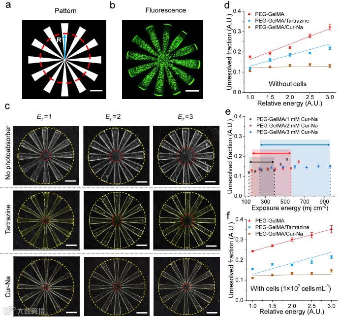 图4. 水平方向打印精度分析。a. 辐条状图案用于评估打印精度,从中心到外围相邻辐条之间的间隙增加。打印精度被定义为模糊区域直径(红色虚线圆圈)与辐条状图案直径的比值。b. 载细胞结构的荧光染色图。c. 打印结构的显微图像,显示了纯PEG-GelMA生物墨水(上)和添加了柠檬黄(中)和Cur-Na的生物墨水(下)的模糊区域(红色虚线圆圈)大小与相对曝光能量的关系。Er指相对能量,定义为实际光能与单位曝光量的比。d. 模糊区域大小与曝光能量的定量关系。e. Cur-Na的高精度打印窗口,灰色、红色、蓝色区域分别代表含1mM、2mM、3mM Cur-Na生物墨水的打印窗口宽度。f. 载细胞打印结构的模糊区域大小与曝光能量之间的定量关系。