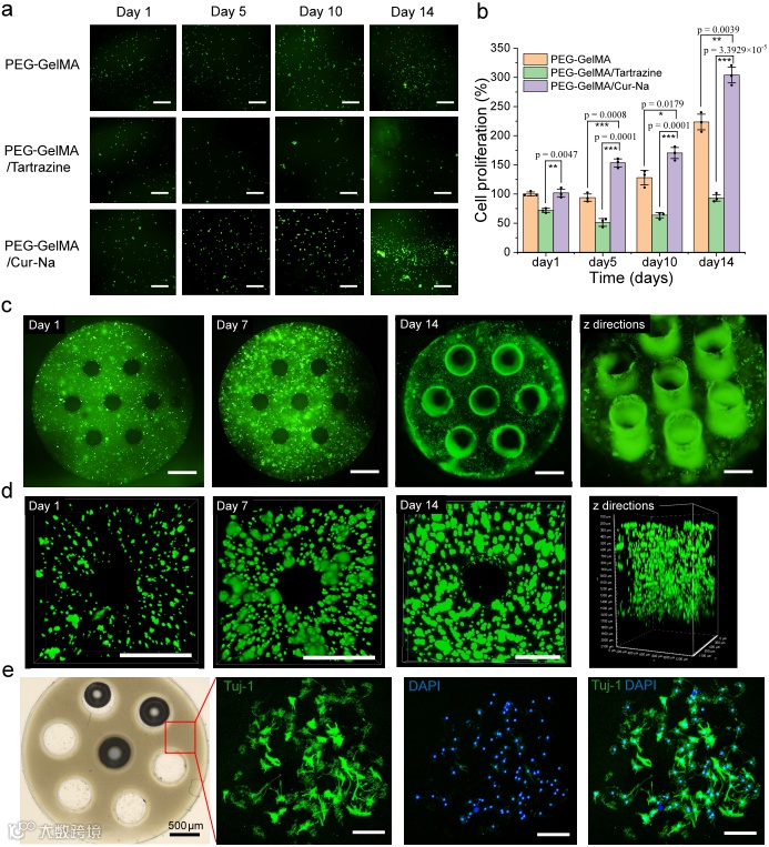 图7. 基于PC-12细胞体外培养的Cur-Na 细胞相容性评价。a. 细胞活死染色荧光图展示了细胞14天的活力(绿色:活细胞;红色:死细胞)。b. CCK-8测定细胞增殖情况。细胞在支架中增殖14天,PEG-GelMA/Cur-Na水凝胶中的细胞展现出最好的增殖效果。c. 使用PEG-GelMA/Cur-Na水凝胶制造的通道支架(直径200μm)的荧光图像显示了均匀的细胞分布。最后一张图像显示了细胞沿着通道的生长情况。d. 第1、7和14天脊髓支架中通道的共聚焦图像。e. 荧光图像显示种植在PEG-GelMA/Cur-Na支架表面的PC-12细胞的分化和突起形成(第7天)。Tuj-1:Beta3-微管蛋白;DAPI:4’,6-二胺基-2苯基吲哚。