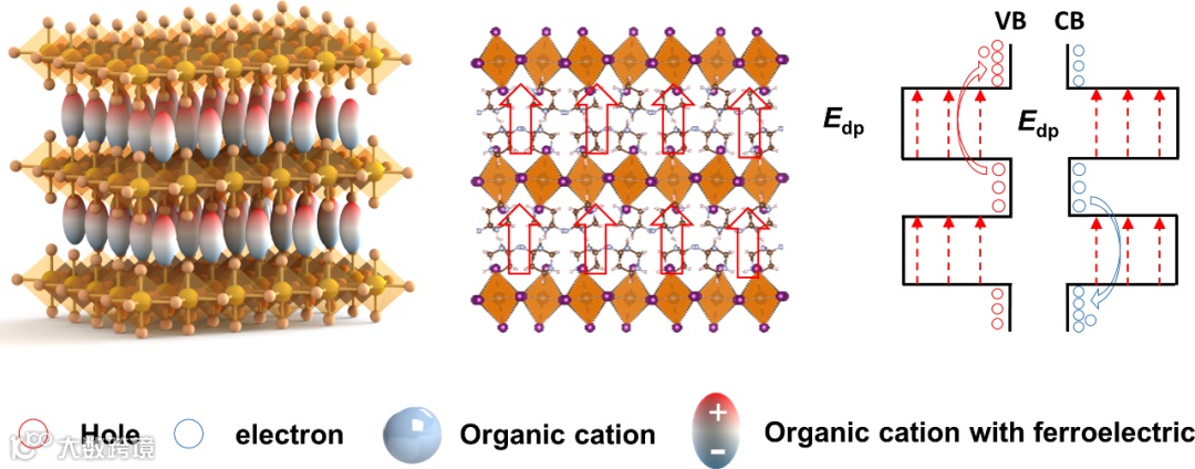 铁电极化场促进载流子面外输运。(左)分子铁电材料的二维结构;(中)铁电场产生;(右)在铁电极化场的作用下,多量子井结构中的载流子被有效分离输运。