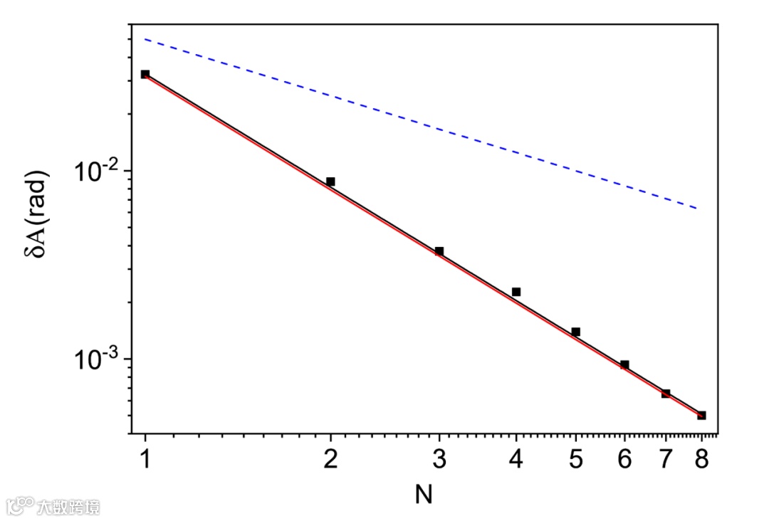 图2 | 实验的测量精度。黑色方点为N个独立演化过程的实验测量精度,红色实线为不确定因果序方法的超海森堡极限(δA=1/N²),蓝色虚线为确定因果序方法的最高精度,即海森堡极限(δA=1/N)。