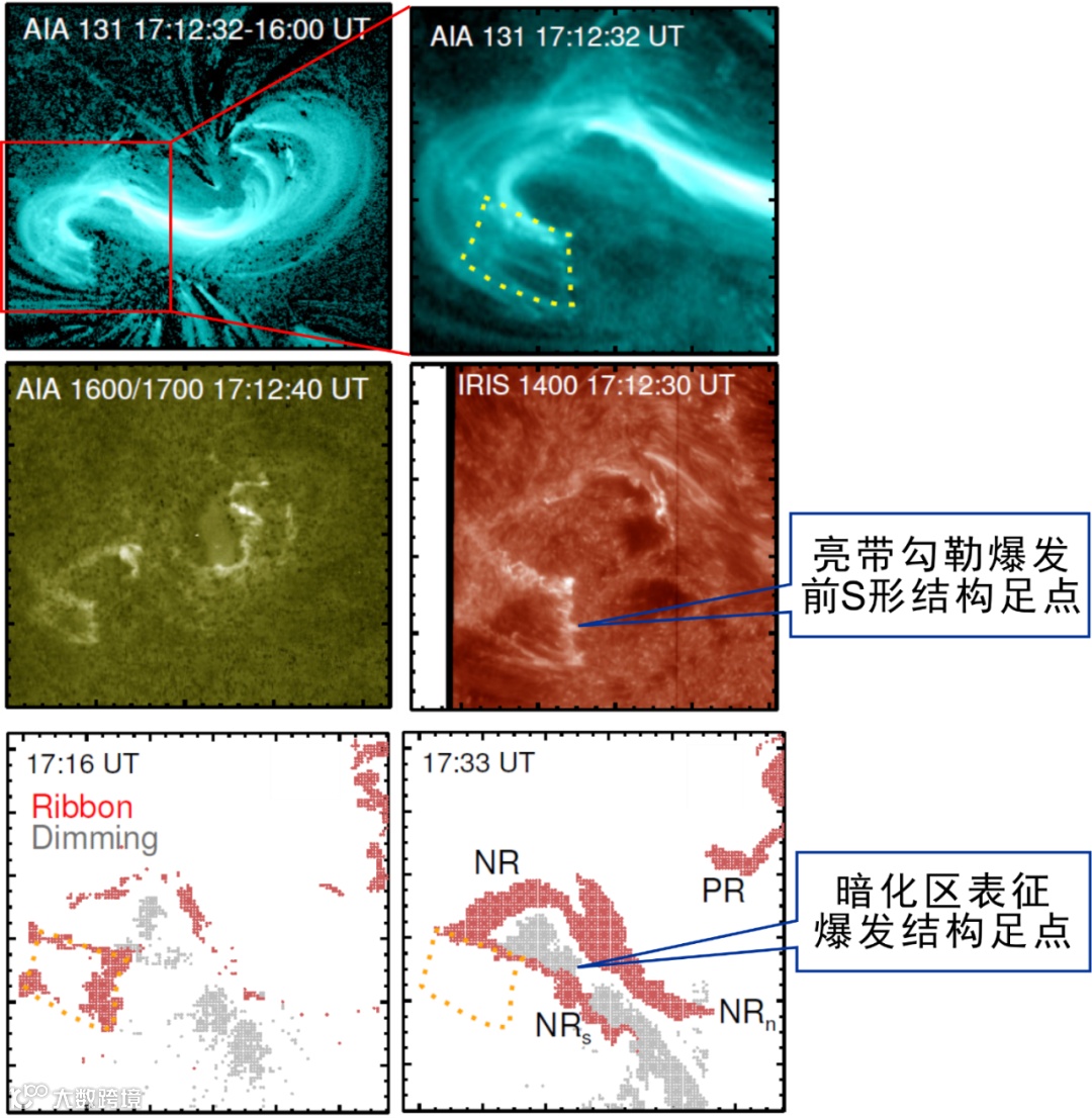 研究团队对发生在2014年教师节的日冕物质抛射事件进行了深入研究,经过多方探索和仔细分析,发现爆发前形成的磁绳结构在爆发过程中经历了一系列复杂的剥蚀、瓦解和重建。观测证据表明,爆发前具有S形结构的磁绳从小尺度的「种子」发展而来(图1),这一过程也为研究团队前期的研究成果提供了不同角度的重要佐证。爆发开始时,磁绳的足点被低层大气中一个梯形的亮带清晰地勾勒出来(图2);在随后的剧烈爆发过程中,爆发结构的足点由于物质缺失表现为日冕中的暗化区(图2)。伴随着太阳色球耀斑带的高度动态变化和日冕暗化区域的随之漂移(图3),爆发结构的足点位置发生了剧烈的迁移,与爆发前磁绳的足点区域几乎没有交集(图2);而根据经典图像,表征爆发结构足点的日冕暗化区本应覆盖原有磁绳的足点。耀斑带末端则呈现极度不规则的形态以及来回拉锯式的运动(图3),揭示磁绳内部以及磁绳与周围磁场间发生着复杂的三维磁场重联。这些现象表明,爆发过程中的三维磁场重联将原有磁绳的磁通量几乎完全替换。这一研究揭示了以前鲜有报导的复杂三维磁重联的细节过程及其在日冕物质抛射形成中的重要作用,同时为行星际空间复杂抛射结构的产生提供了新的物理解释,也为空间天气预报带来启示。