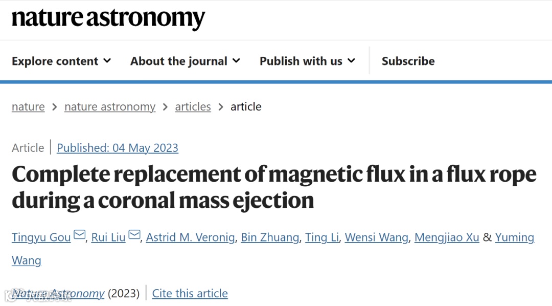 中科大日地空间物理研究团队在太阳爆发活动的研究中取得重要进展,发现爆发结构在早期爆发过程中发生了复杂的重构演化,研究成果以「Complete replacement of magnetic flux in a flux rope during a coronal mass ejection」为题,于2023年5月4日发表在国际学术期刊《自然·天文》(Nature Astronomy)。