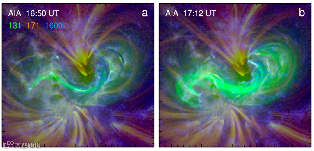 图2 | 爆发前磁绳足点与爆发结构的足点几乎无交集,表明磁绳中的磁通在爆发过程中通过磁场重联被完全更替