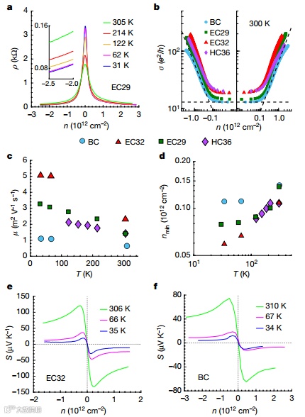 作者展示了在悬浮SiO2薄膜微桥结构的中心梁顶部组装的hBN/SLG/hBN异质结构。中央样品桥两端SiO2梁上的四条U形Au/Cr线用作电阻加热器和温度计,用于获得样品热阻电导率σ=1/ρ。将电压施加到底部hBN和SiO2桥之间的Pt 栅极,以调节电荷浓度n=ne-nh,其中ne和nh分别是电子和空穴密度。通过石墨烯/hBN界面之间的不对称性和μ的测量,揭示了e-ph相互作用的影响,并探究了e-ph相互作用对T、n和μ的依赖性。