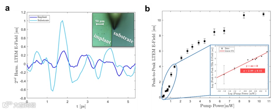 首先,当用超快蓝光泵浦时,未注入的基底和注入的区域都会发出太赫兹脉冲。图2a显示了由蓝光激发的THz脉冲,在探针敲击频率的二次谐波处解调得到的结果。可以观察到,轻度掺杂的基底比重度掺杂的植入区域产生明显更多的太赫兹发射。为了更好地理解太赫兹的产生机制,研究人员测量了发射的太赫兹峰峰值与蓝色泵浦光束的平均功率之间的关系,如图2b所示。当功率在大约2 mW以上,太赫兹发射强度受蓝光功率增加的影响较小;事实上,一旦泵浦通量足够高,很大一部分可用的电荷载流子将被光激发,任何多余的泵浦光子将被高的局部导电性屏蔽。由图2b中的插图可以看出,发射的太赫兹场的振幅和泵浦光功率之间有一个明显的二次方关系。这表明THz产生的主要机制是双光子吸收;价带中的载流子吸收了超过6 eV的泵浦能量,并被激发到远高于块状Si的宽4.2 eV的直接带隙之上。该实验结果为扫描近场光学显微镜方法在宽带隙材料上的应用提供了新的可能性。