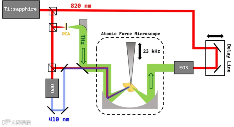 图1是激光路径和扫描近场光学显微镜实验装置示意图。近红外、蓝光和太赫兹光束分别产生,其中太赫兹脉冲使用传统的光电导天线产生,所有的三束光重叠并耦合到原子力显微镜中。散射或发射的太赫兹脉冲在另一侧通过自由空间电光采样进行相干检测。