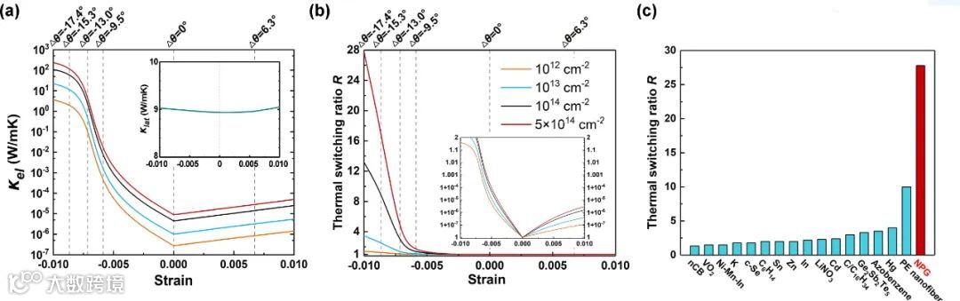 基于NPG材料,作者建立了对应器件模型,并通过分子动力学与第一性原理方法计算了器件的晶格热导率与电子热导率。如图5所示,通过收缩变形,其电子热导率有9个数量级的变化,但晶格热导率变化不明显,从而在变形前后改变了载热单元的主导种类,获得高达27.78的热开关比。