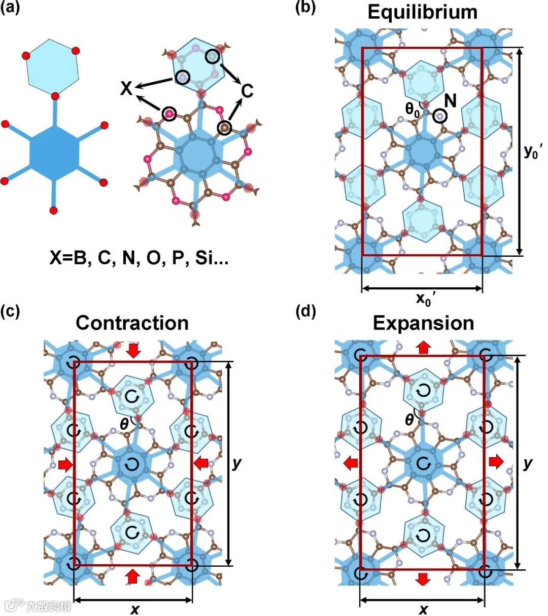 图3 基于二维蜂窝剪纸机构的超材料设计与映射关系。(a) 模块I与模块II分别用六元环、团簇替代,粉红色位点为掺杂元素。根据不同元素掺杂超材料的拓扑结构与能带结构,N元素为最佳掺杂元素; (b-d) NPG变形过程中的平衡态、收缩态、展开态。棕色和白色位点分别为C元素与N元素。
