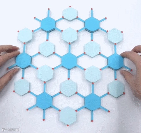 作者首先设计了一种二维蜂窝剪纸机构,如图1所示,两种类型的模块单元根据设定的几何关系进行排布并通过一系列铰接点连接组成,经过计算该剪纸机构的泊松比为−1。如图2所示,对其挤压和拉伸后,其能通过模块的旋转与耦合发生折叠和展开变形。将六边形模块作为其主要设计单元,便于后续将石墨烯蜂窝状的材料结构作为骨架,从而保证材料的稳定性。同时其结构具有足够的孔隙来提供变形的空间自由度,在材料中原子间存在斥力的情况下,也能在一定范围内实现对应变形。