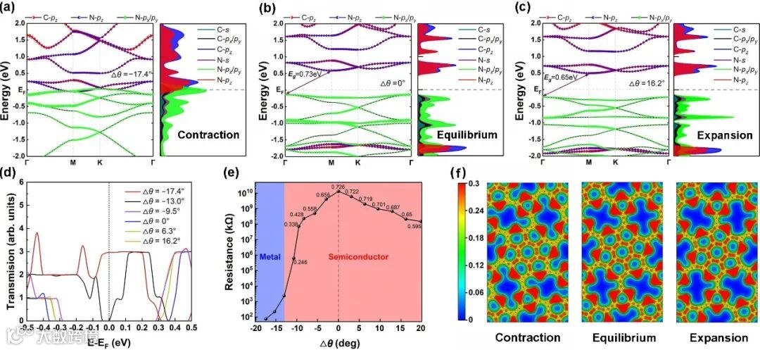 图6. 变形过程中NPG能带结构、电子输运性能以及电子结构的变化。(a-c) NPG收缩态、平衡态、展开态下的轨道投影能带结构与轨道投影态密度 (d-e) NPG器件在不同变形状态下的电子透射谱与电阻大小 (f) NPG不同变形状态下电荷密度等值面图