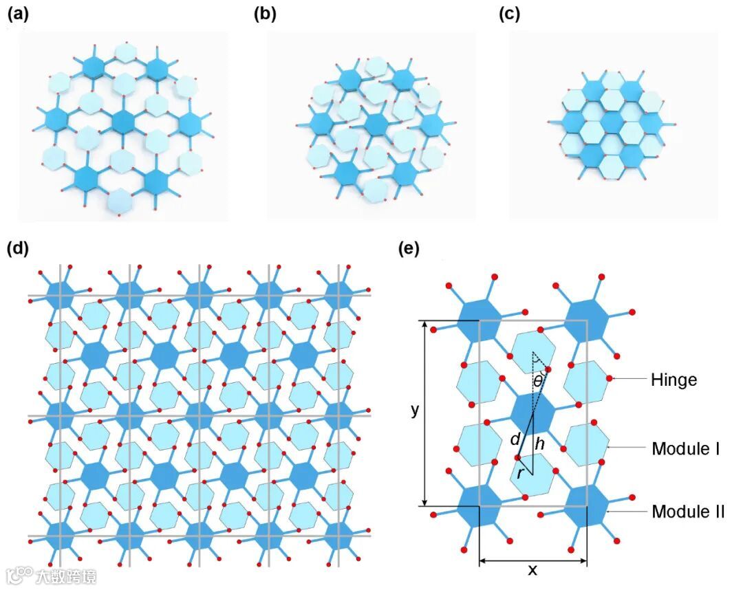 图1 二维蜂窝剪纸机构示意图。(a-c) 折展拓扑机构运动过程的展开态、中间态、收缩态; (d)机构的周期性原胞; (e)机构的组成模块及几何参数。