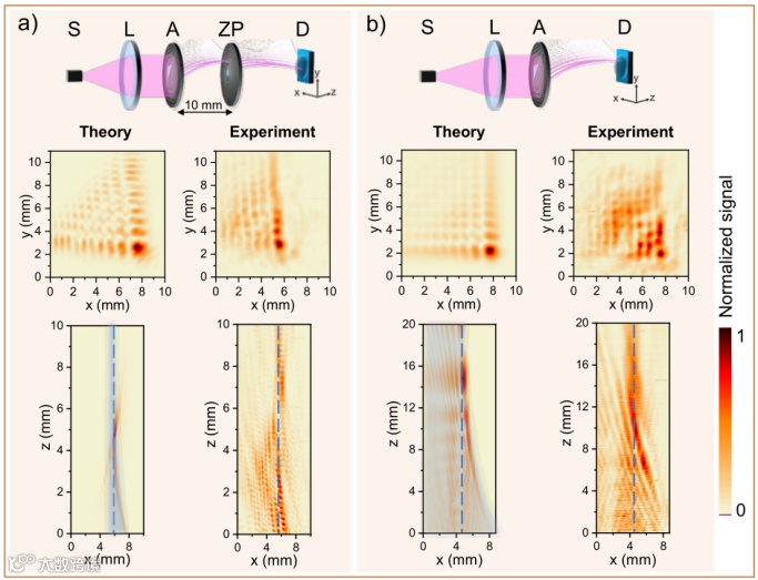 图2 数值计算与实验测试的非傍轴艾里光束的强度分布,S,A,ZP,D分别表示太赫兹光源,艾里相位掩模版,非傍轴波带片,太赫兹探测器;(a) 使用艾里相位掩模版的强度分布;(b) 只使用艾里透镜的强度分布。