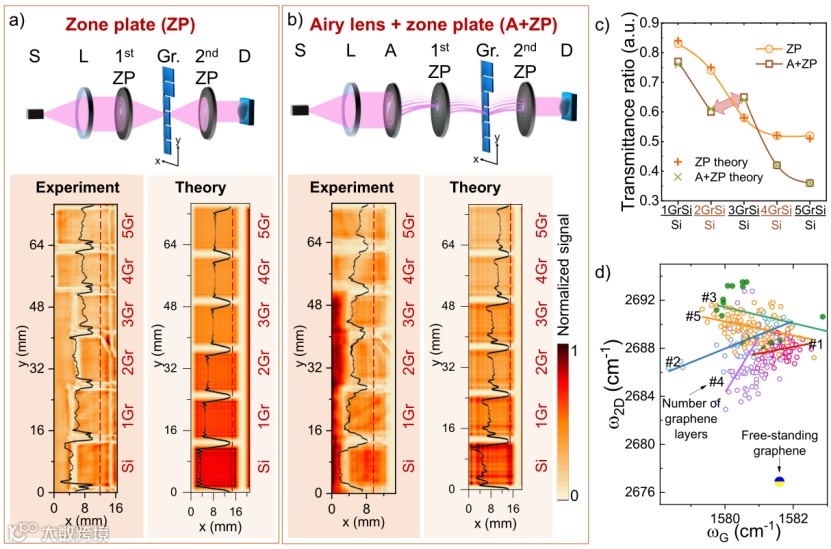 图3 非傍轴太赫兹结构光照成像,被测样品由图中所示的不同层数的石墨烯组成。通过不同的透镜组合产生的太赫兹照明:(a)两个波带片;(b)一个艾里相位掩模版与两个波带片组合。(c)1-5层石墨烯的拉曼2D与G峰位置的相关性;(d)蓝/黄色点表示独立的石墨烯。
