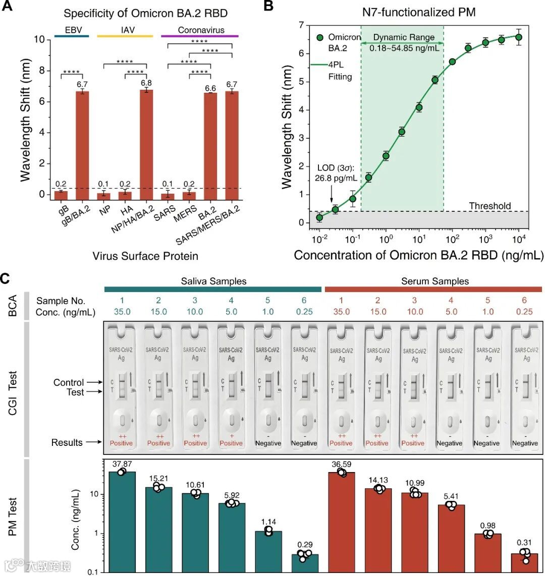 除了评估等离激元模式与mAb/RBD亲和力特性,创新团队还进行了唾液和血清样品中奥密克戎BA.2 RBD特异性应用检测研究。如图4所示,N7功能化的等离激元超表面生物传感器可以特异性地且充分地识别奥密克戎BA.2,有望进一步应用于医学检测分析领域。在唾液和血清样本的测试中,等离激元超表面检测结果与校准浓度表现出良好的一致性,传感检测限为26.8 pg/mL,比现行胶体金CGI-LFA小2个数量级,这表明了该方法在临床样本中定量检测新冠奥密克戎变异株的可行性。未来,研究团队会进一步探索等离激元超表面的分子结合动力学,用于快速筛选针对新出现新冠变异株的高亲和力单克隆抗体。