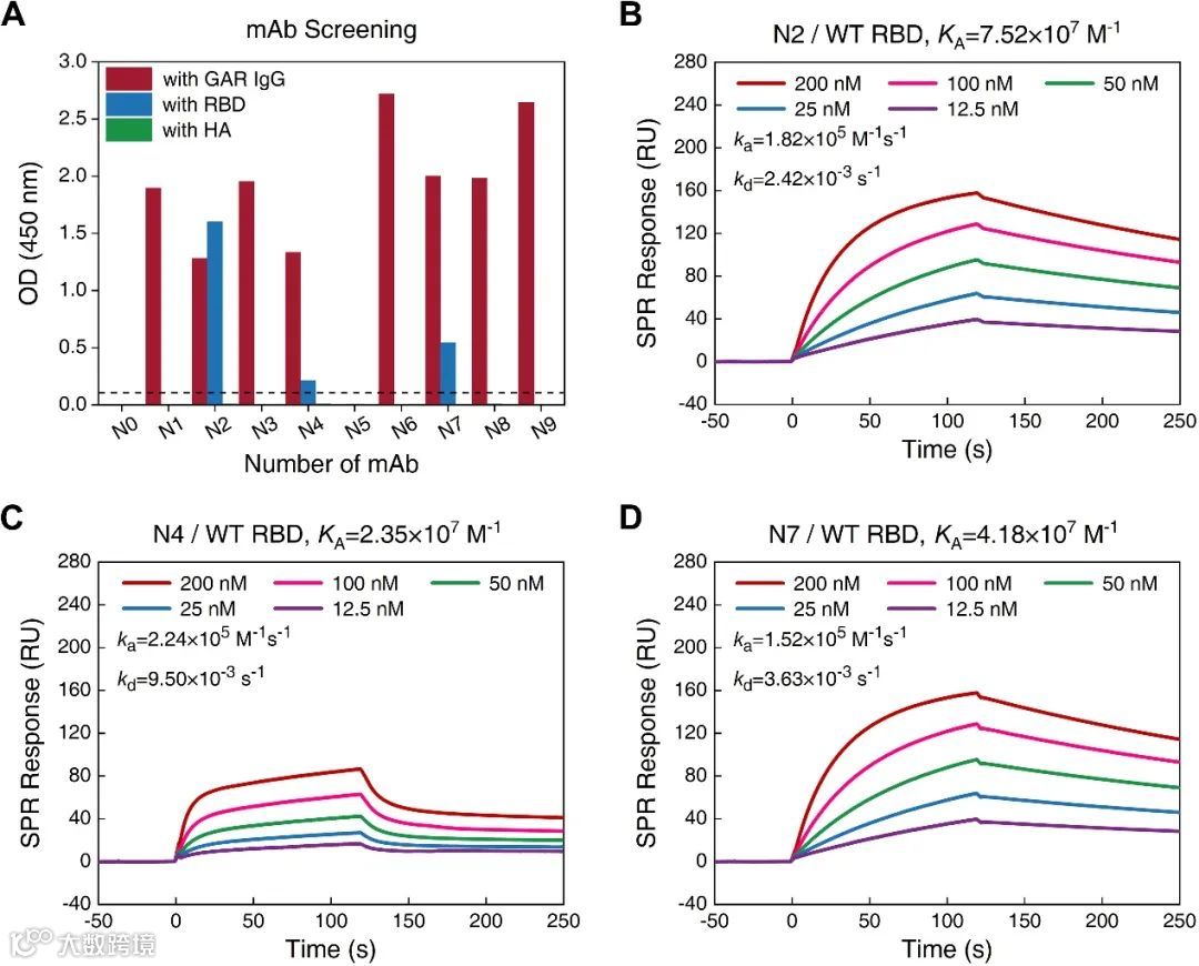 为了制备高亲和力广谱单克隆抗体(mAb),该团队采用多参数流式细胞术单细胞分选、酶联免疫吸附试验在上清液中表达可检测的兔源免疫球蛋白IgG,筛选出具有RBD特异性结合的三种mAb(N2、N4和N7)作为候选抗体。图2B至图2D为基于传统棱镜耦合表面等离激元共振(SPR)免疫测定结果,分析表明N2和N7是研制SARS-CoV-2高性能等离激元超表面免疫传感器的最佳候选单克隆抗体。