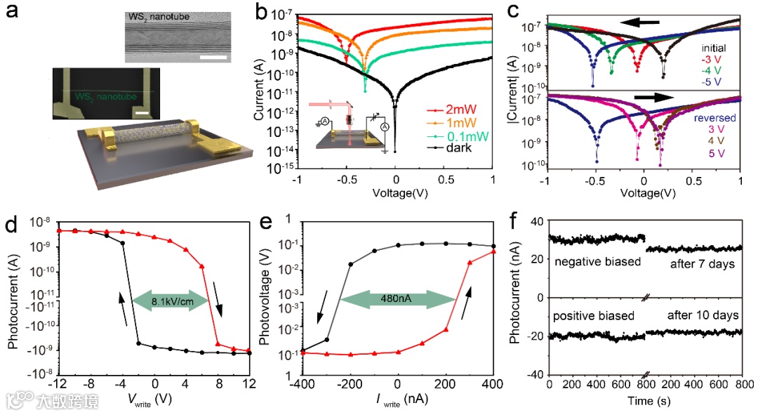 图1 WS2 纳米线PV-RAM器件(a)器件示意图(b)器件的光伏响应(c)光伏响应的可编程性,(d-f)光伏响应的铁电回滞和存储