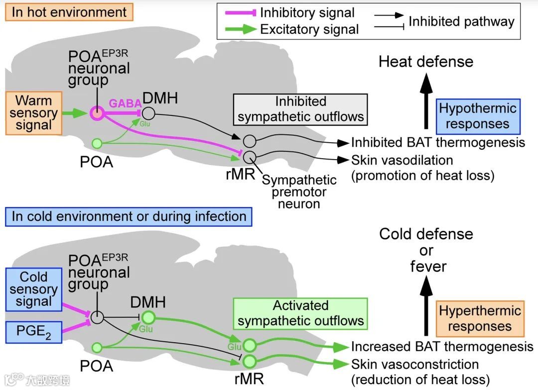 自主神经温度调节反应的中枢调节由下丘脑视前区(preoptic area,POA)的温度调节中心和涉及下丘脑背内侧区(dorsomedial hypothalamus,DMH)和中缝口侧髓质区(rostral medullary raphe,rMR)的交感兴奋性传出通路介导。然而,POA热调节中心控制交感兴奋通路的机制原理仍有待阐明。