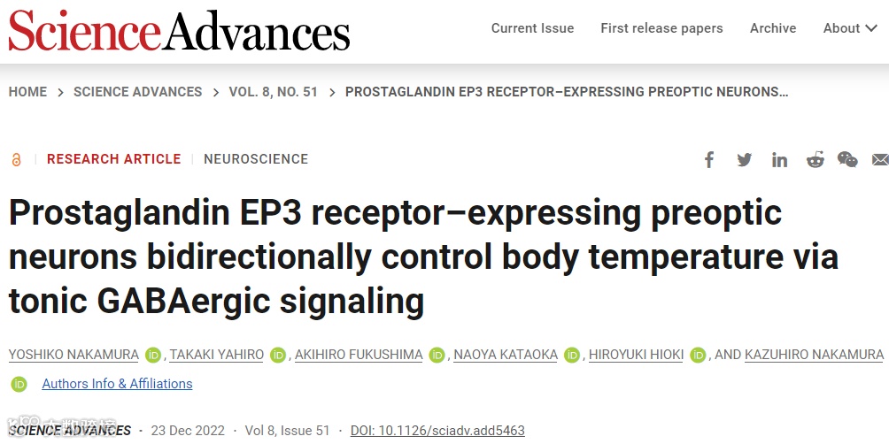 2022年12月23日,日本名古屋大学KAZUHIRO NAKAMURA团队在Science Advances 杂志在线发表题为“Prostaglandin EP3 receptor–expressing preoptic neurons bidirectionally control body temperature via tonic GABAergic signaling”的研究论文,该研究确定前列腺素EP3受体表达的POA神经元(POAEP3R神经元)作为中枢温度调节机制中的关键双向控制器。POAEP3R神经元在升高的环境温度下被激活,但被前列腺素E2(一种热原介质)抑制。在室温下对POAEP3R神经元的化学刺激通过增强散热来降低体温,而抑制它们会引起涉及棕色脂肪产热的热疗,模拟发烧。
