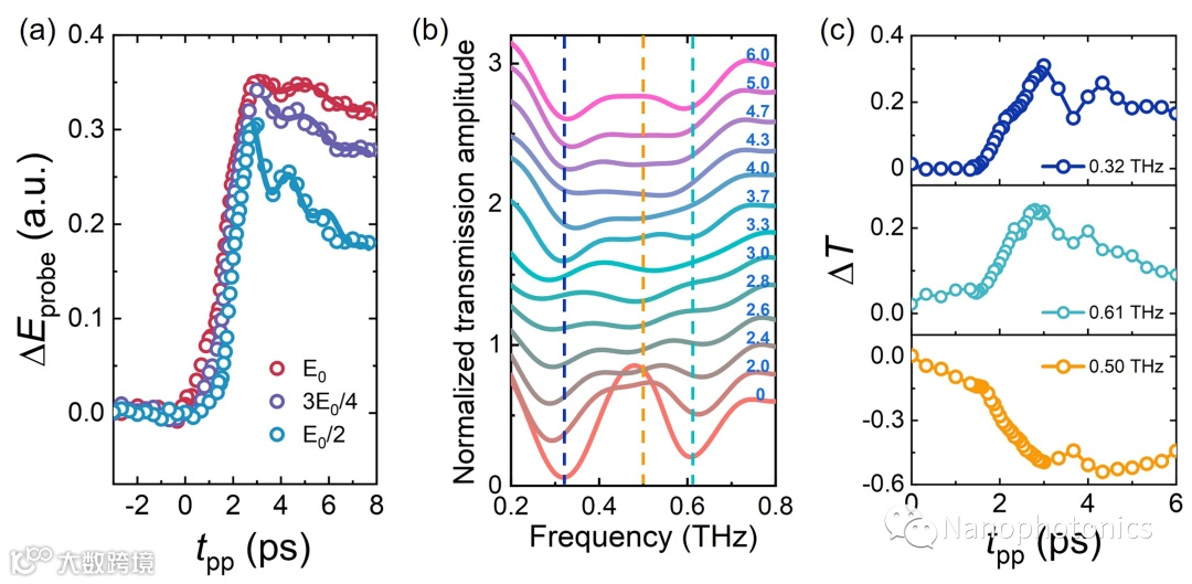 研究人员进一步发现,在不同太赫兹泵浦强度下,tgate = 5.7 ps处的电场变化(ΔEprobe)的时间曲线呈现出周期性振荡,与NbN薄膜上观测到的Higgs模式振荡现象类似。对ΔEprobe随时间变化的曲线进行拟合,得到了Higgs模式的振荡频率,振荡频率随场强增大而逐渐减小。在对应的频谱上,三个谐振频率处的透射系数变化量(ΔT)在tpp = 3 - 6 ps范围内表现出周期性的振荡行为(见图4)。金属谐振器之间的耦合系数随着超导序参量(即超导性)的振荡而变化。研究结果表明,Higgs模式振荡可以周期性地改变金属腔之间的耦合,从而可以实现对太赫兹波的超快调制。