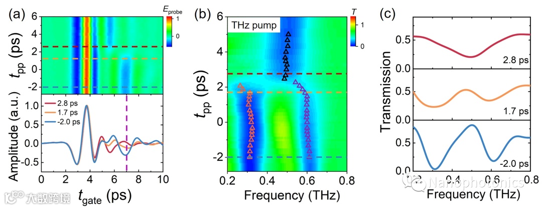 随后,研究人员利用太赫兹泵浦-太赫兹探测时域光谱,在2.8 ps 时间范围内实现了谐振模式切换,最大开关比为11 dB。分析时域信号发现,在tgate = 3.5 ps附近,主脉冲在时域上没有明显的振幅变化和时间偏移。相反,在tgate = 5.7和7.0 ps附近,拖尾信号发生了显著的变化(见图3)。