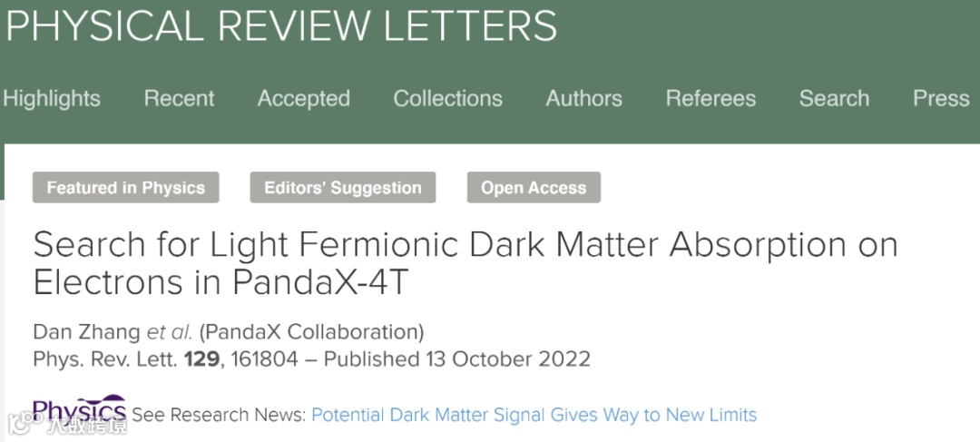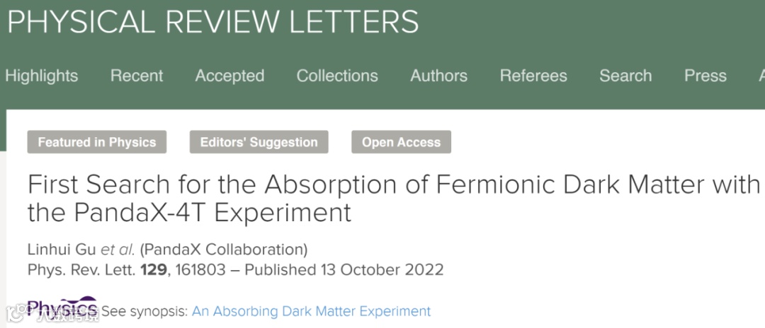 近日,上海交通大学牵头的PandaX合作组在《物理评论快报》上以两篇「编辑推荐」论文分别发表了PandaX-4T上寻找费米子暗物质被电子吸收和原子核吸收的信号(Fermionic Absorption Dark Matter)的探测结果【PRL 129, 161803 (2022),PRL 129, 161804 (2022)】。这是首次由暗物质直接探测实验开展分析寻找这一吸收型轻暗物质新型信号,美国物理学会Physics杂志以「An Absorbing Dark Matter Experiment」和「Potential Dark Matter Signal Gives Way to New Limits」为题为这两篇文章做了亮点报道。