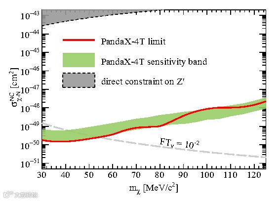 非常类似于电子吸收反应道,原子核吸收暗物质,在直接探测实验中核反冲信号能谱上产生独特的单能量峰的形状特征,这和传统暗物质产生的大范围核反冲能量信号完全不同。为了研究这种窄能谱核反冲信号,PandaX合作组系统研究了低能核反冲信号在PandaX-4T探测器的能量分辨率,结合数据驱动和模拟仿真的技术检验了核反冲信号响应模型。在此基础上,PandaX实验在国际上首次在核反冲信号区中开展了窄能谱扫描,对于质量在40MeV附近的轻暗物质,实验将探测灵敏度推到了1.5x10-50cm2的水平。该结果对新物理理论可以做出严格的检验,比如对同传递弱相互作用的Z玻色子类似的Z’玻色子的限制远强于对撞机实验。