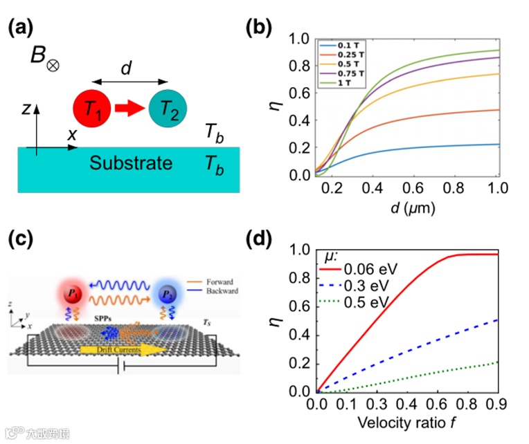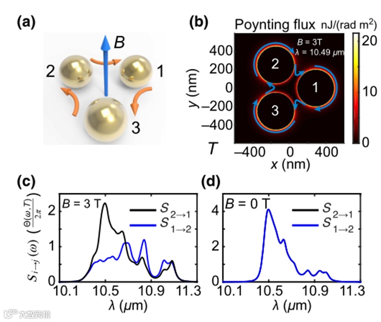 首先是热平衡时的持续热流。传热通常是由温度梯度驱动的。然而,在电荷和质量现象,如超导和超流,可以存在一种没有任何外部偏压的电流。最近,有人指出,在打破洛伦兹互易的多体系统中,热平衡状态下可以存在持续的热流。这里介绍了由三个n-InSb球组成的三体系统,外加磁场正交与球的平面(图5a)。当外部磁场为3T时,在热平衡状态下,球体和环境中的热噪声源驱动下的Poynting磁通显示出持续的热电流(图5(b))。在外加磁场作用下,两个相反方向的物体之间的换热谱表现出强烈的对比(图5(c))。相反,当没有外部磁场时,两个相反方向的换热谱完全相同,如图5(d)所示。由此得到,为了使持续的热流存在,洛伦兹互易必须被打破。