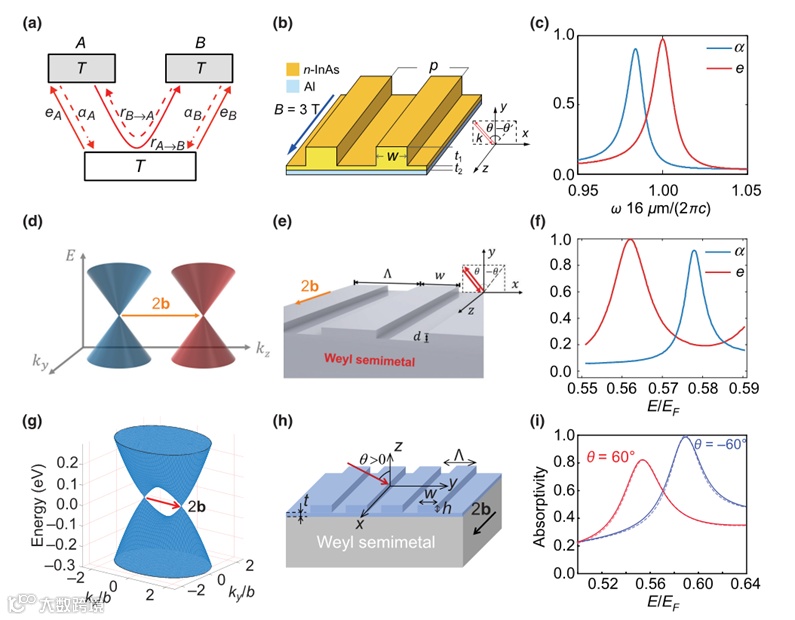 然后作者讨论了非互易发射和吸收的最新进展,以及打破洛伦兹互易的材料的辐射传热。要达到收集入射辐射、收集出射辐射、热光电伏,并同时收集太阳和外层空间的热力学极限,必须打破洛伦兹互易性。作者首先讨论了使用磁响应实现非互易发射和吸收,这里有两种材料,一种是利用外加磁场实现非互易性的磁光材料,另一种则是无需外加磁场便可实现非互易的磁性外尔半金属(WSM)。对于磁光材料,这里介绍了在铝顶部加一层n-InAs光栅的结构(图2b),可以看到,在外加磁场为3T时几乎完全打破了基尔霍夫定律。对于外尔半金属,首先是基于Voigt几何的WSM光栅(图2e),直接计算表明,在TM极化中,基尔霍夫热辐射定律可以在没有磁场的情况下得到强烈的分解(图2(f))。在另一项研究中,考虑在WSM上放置介质光栅(图2(h))。如图2(i)实线所示,两个相反方向的吸收率对比强烈。