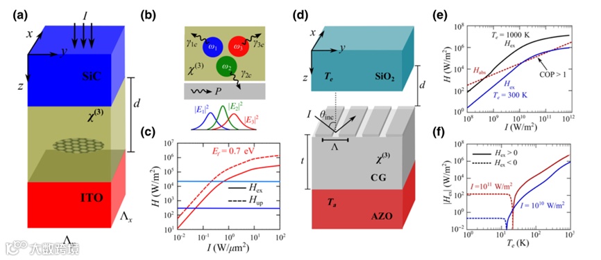 接着作者又讨论了利用克尔(Kerr)非线性实现非互易发射和吸收,在偏振与电场呈非线性关系的非线性材料中,洛伦兹互易性可以被打破。利用Kerr χ(3)非线性控制热辐射需要考虑一个三谐振腔系统,这样一个方案的物理构造涉及到一个ITO吸收器(谐振器3)和SiC发射器(谐振器1),与非线性 χ(3)间隔(图4(a))。基于耦合模理论的计算表明,即使两个衬底处于相同的温度下,SiC发射极也会提取热量(图4(c)),从SiC发射器提取的热量随着激光强度的增加而增加,可以大大超过300和0 K之间温差驱动的辐射换热。作者又进一步分析了低损耗介质谐振系统中的近场制冷(图4(d)),该系统包括一个二氧化硅发射体和一个由AZO、CG层和介质光栅组成的吸收体。研究表明,克尔非线性在制冷方面具有巨大的潜力。