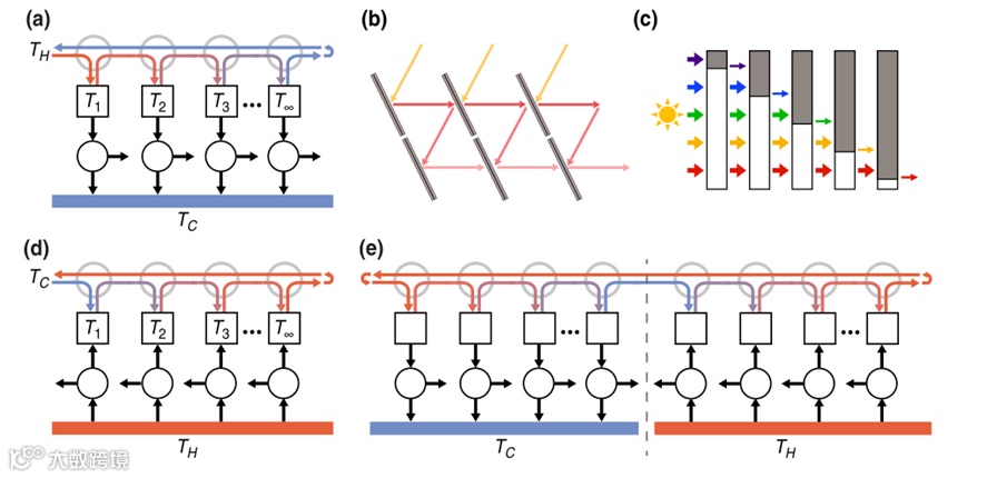 作者首先讨论了使用非互易系统可以在热力学极限实现光子能量转换。为了实现基于非互易系统的能量转换,开发非互易发射体和吸收体是至关重要的。作者从一个接近热力学极限的非互易系统出发(图1a),发现该系统收集辐射的效率接近Landsberg极限,并且在一定的环境下远超互易系统收集辐射的极限效率。在基于反射的装置中(图1b),通过使用基于非互易发射器的太阳能电池,其效率显著高于对称光伏电池的极限效率。最近,出现了基于半透明非互易吸收体的非互易多结太阳能电池,提出了一种达到Landsberg极限的简化方案(图1c)。然后又介绍了一种采用Landsberg方案收集热辐射的装置(图1d),发现其功率输出远超互易系统,突出了使用非互易系统收集输出热辐射的巨大潜力。