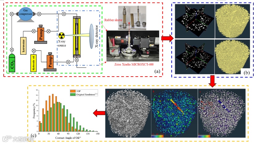 图3. 基于原位CT成像的微观可视化多相渗流试验(a)团队自行设计的用于原位CT成像的微观可视化渗流试验系统;(b)3DP岩心饱和油状态(上部)和CO2驱油后(下部)3DP岩心中油相分布的微CT图像;(c)CO2驱油后3DP岩心中CO2分布及对应的孔隙网络模型,以及3DP岩心和原始岩心中残余油相原位润湿角计算结果的对比