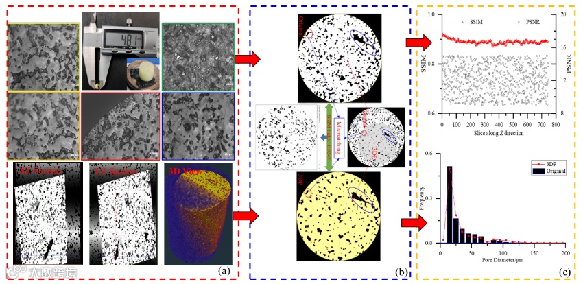 图2. 3D打印岩心与天然岩心微观孔隙结构的对比分析(a)基于偏光显微镜和CT成像得3DP岩心孔隙结构表征;(b)基于图像校准的3DP岩心与原始岩心孔隙结构拓扑形态特征的对比分析;(c)孔隙结构特征参数的计算与分析