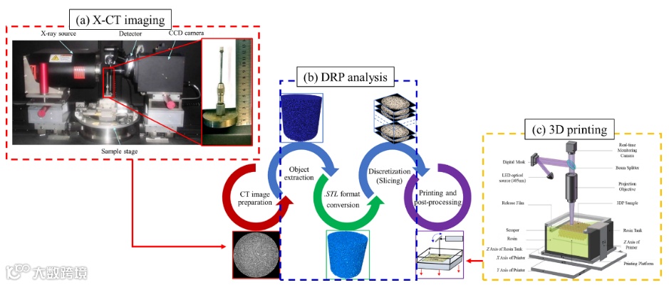 图1. 基于CT图像与面投影微立体光刻技术的致密砂岩微观孔隙结构提取与3D打印制备流程(a)天然致密砂岩的微CT扫描;(b)数字图像处理与岩心重建;(c)面投影微立体光刻3D打印成型