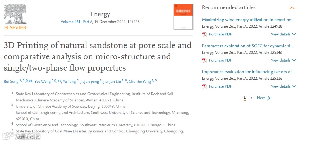 近期,中国科学院武汉岩土力学研究所的宋睿副研究员、刘建军研究员、杨春和研究员联合西南科技大学的汪尧博士等人提出了一种利用3D打印和微CT成像技术实现致密砂岩复杂孔隙结构定量表征和多相流体输运特性的可视化研究方法。研究团队利用新型的面投影微立体光刻技术(PμSL,nanoArch S130,摩方精密)实现了致密砂岩孔隙模型的原位尺度打印(~2μm光学分辨率),再现了致密砂岩复杂孔隙系统的三维拓扑结构特征与空间连通性。研究人员对比分析了3DP岩心与数字岩心(DRP)模拟得到的孔径分布(PSD)、孔隙度和绝对渗透率的差异;同时结合原位CT成像技术开展了3DP岩心可视化CO2驱油实验,并与实验基准数据进行了比较。研究成果为定量表征岩石复杂孔隙结构特征及其中多相流体输运机制提供了新的工具,具有广阔的应用前景。论文研究工作得到国家自然科学基金,武汉市知识创新专项(基础研究)和四川省自然科学基金等项目的支持。相关研究成果以“3D Printing of natural sandstone at pore scale and comparative analysis on micro-structure and single/two-phase flow properties”为题发表在《Energy》期刊上。