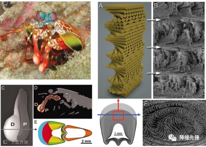 在自然界中,最著名的抗冲击结构可能是口足类动物。螳螂虾是一种甲壳类动物,有锤子状的棍子,可以以非常高的速度撞击猎物(主要是贝壳),达到高达10000g的加速度,甚至在水中产生气穴。为了在不失效的情况下承受重复冲击,爪需要极端的刚度、韧性和冲击阻尼,并且已经成为主要的生物系统之一,集中体现了冲击损伤耐受性的生物优化。