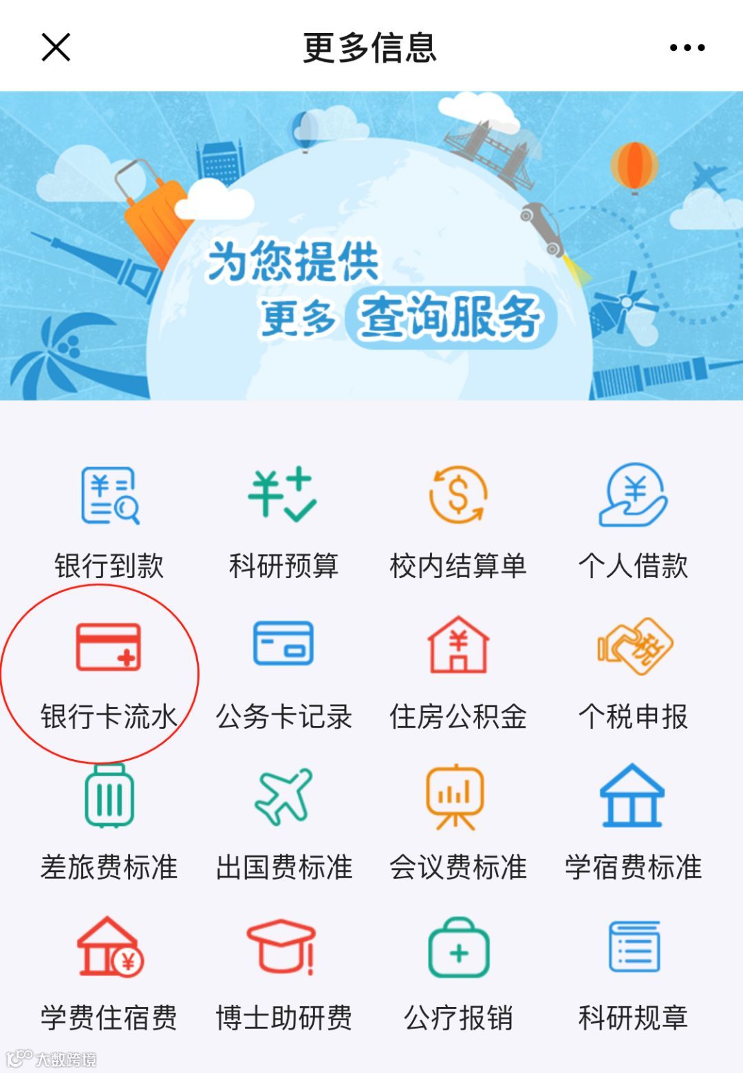 微信公众号-银行卡流水查询 学生可通过财务处微信公众号-更多信息-银行卡流水功能查询自己的补助发放明细。(如下图所示) 通过银行卡流水还可以查询财务报销款、公费医疗报销款。