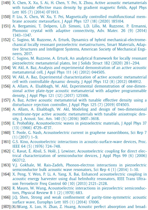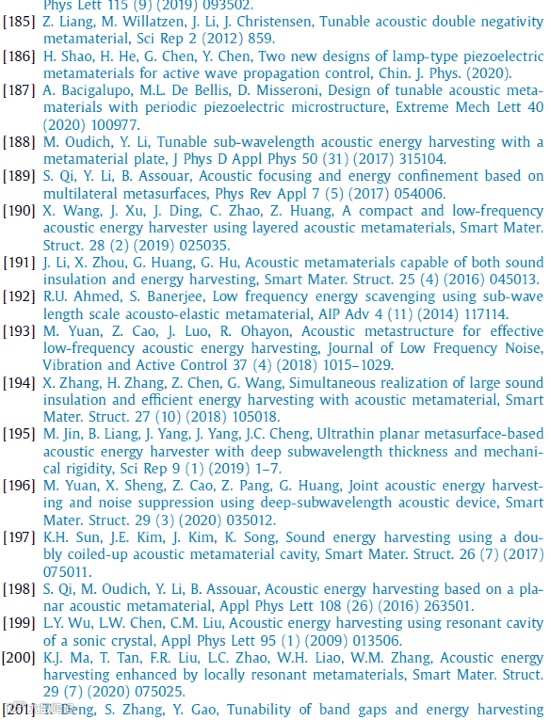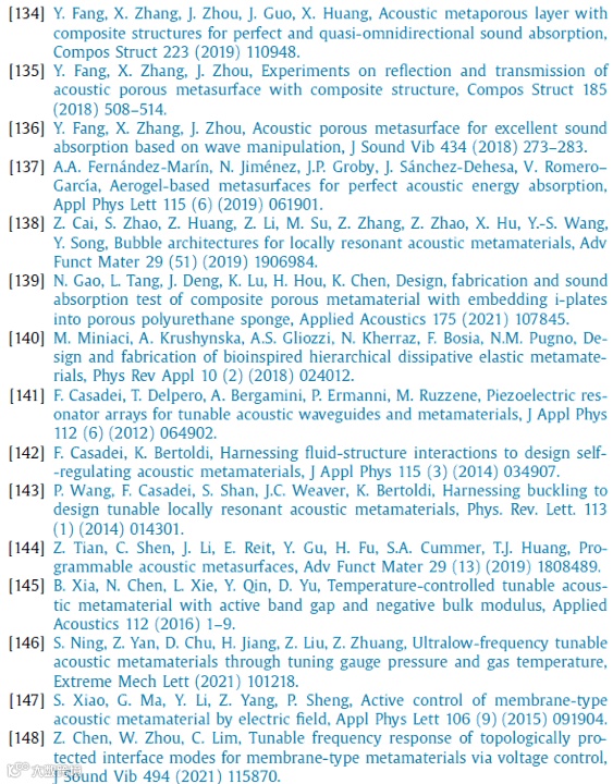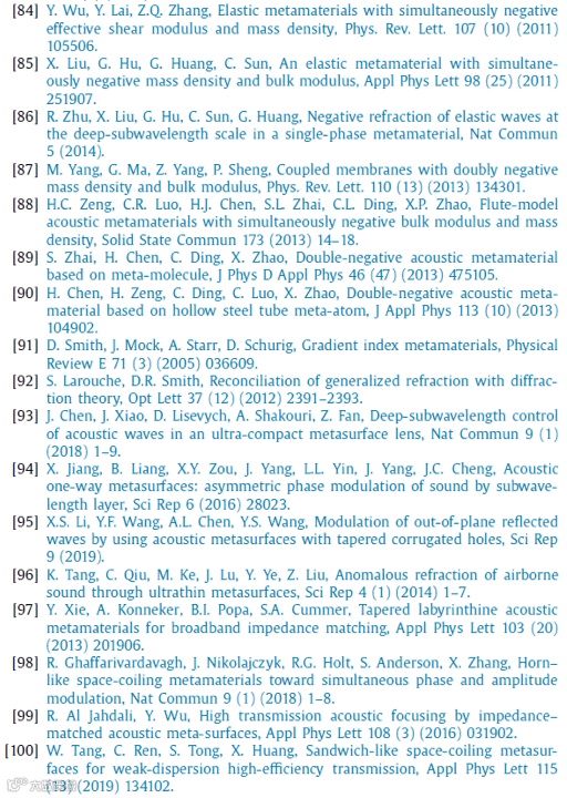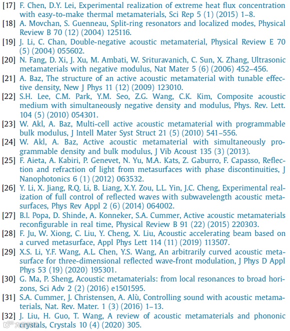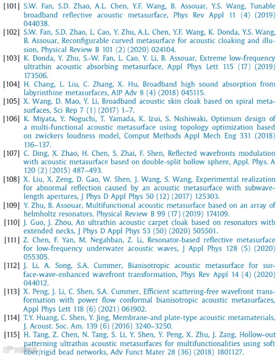 声学超材料和超表面的领域在过去二十年中迅速发展。声学超材料的奇异材料特性被认为是对传统材料特性的突破,这可能促成许多新兴技术的突破行业的发展。在物理和工程应用方面,人们提出了令人振奋的前景,如吸声器和抑制器、波操纵、隐身、能量收集、通信、成像以及性能改进、小体积或轻量化的医疗设备等。