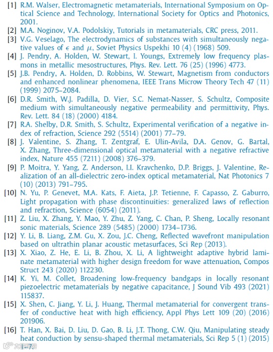 开发超材料的最早研究工作涉及电磁学。通常,定义介质中电磁场行为的基本参数是相对介电常数、相对磁导率和折射率,它们通常是大于或等于1的正数。Veselago指出,在19世纪中叶,同时具有负介电常数和负磁导率的介质可能会导致电磁场中的负折射[3]。然而,直到大约30年后,当Pendry创建了导线介质结构[4]和裂环结构[5]以分别生成负介电常数和负磁导率,人们才知道如何制造具有负折射率的材料。受到Pendry工作的启发,Smith等人提出了具有高工程可行性的所谓双负超材料[6],并首次在实验室观察到了反常负折射现象[7]。电磁超材料的概念推动了光学的快速发展[8-10]以及相关的声学领域 [11,12] 、机械振动[13,14]甚至热传导[15-17],其中波具有相似的物理特征。