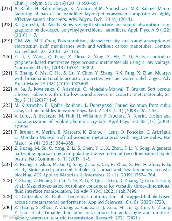 近年来,利用多孔结构拓宽有效带隙的软质多孔材料正受到人们的关注。纤维材料是一种有效的开孔多孔泡沫材料,通过调整纤维直径和填料,易于进行密度控制[213–220]。这种方法可以提供改进的与空气的阻抗匹配。类似地,水凝胶[221]、弹性体[222]、气凝胶[131]和软纤维/珠状复合材料[115]等柔性材料已用于实现与空气匹配良好的声学超材料。气泡晶体是水中软声学超材料的代表,在分析[223,224]和实验[138,225]中已显示出有吸引力的带隙。使用分析气泡和泡沫的有效方法[226],气泡声学超材料在波操纵应用方面具有巨大潜力,如水下全反射、绝缘和掩蔽[227–229],以及增强的水-空气声传输[230]。受被动声学超材料的启发,基于纤维压电材料的主动软声学超材料在未来可能同时拓宽和调谐有效带隙。然而,活性纤维压电材料声学超材料的发展仍处于早期阶段,因此研究人员面临着在物理机制之间做出选择以及在制造方法限制范围内优化技术性能的挑战。