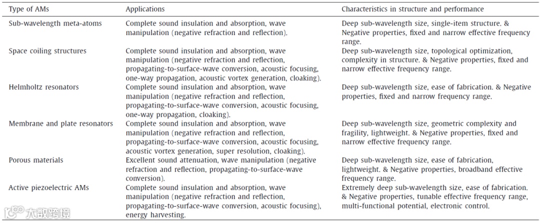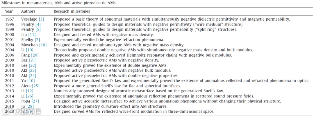 声学超材料(AMs)是具有异常有效特性的人造材料,可以操纵声波,并在过去二十年中得到了大量研究。上表总结了超材料领域的研究里程碑,特别是声学超材料。被动声学超材料通常无法将外部能量输入到声波中。最初的被动亚波长超原子是为了展示高的声音传输损耗而创建的[11] ,随后被动声学超材料以空间盘绕结构的形式分为亚波长超原子和周期性声学超表面,亥姆霍兹谐振腔、膜谐振器和多孔超材料等。