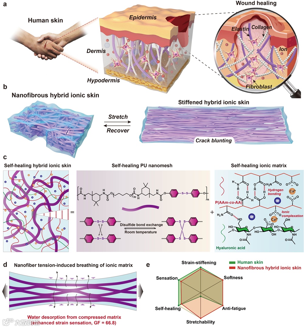 图1. 耐疲劳自修复离子皮肤的仿生设计与综合性能对比