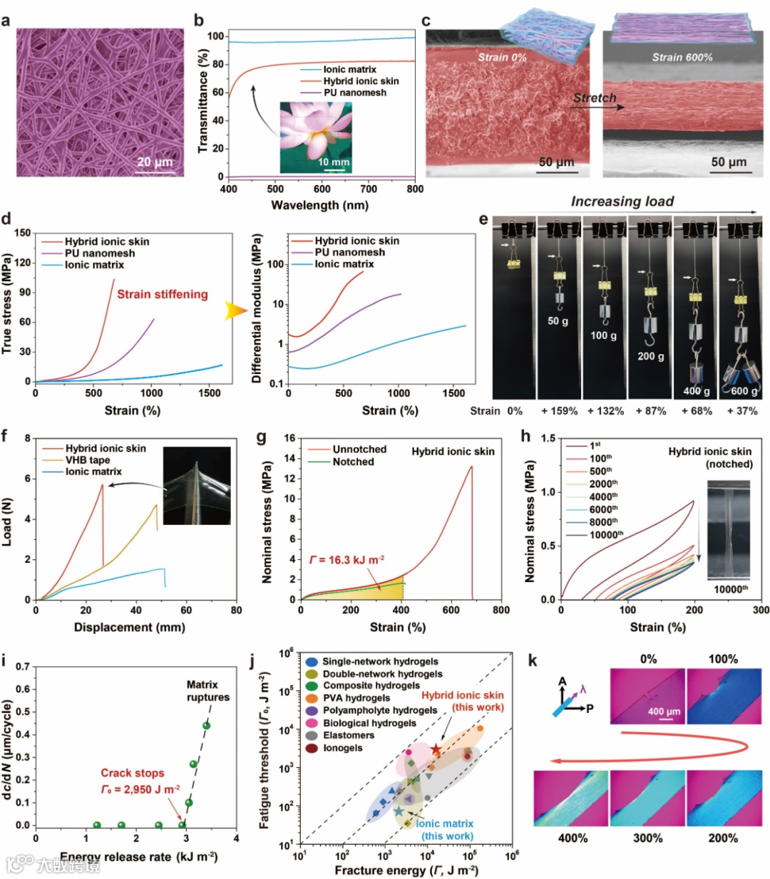通过模拟皮肤的纤维复合结构,复合离子皮肤表现出与真实皮肤非常相似的力学行为。例如,复合离子皮肤初始模量较低(1.8 MPa),但拉伸具有典型的J形应力-应变曲线,表现为强烈的应变硬化行为,模量提升约37倍。这一特殊力学响应符合皮肤真实力学行为,触摸柔软,而拉伸迅速硬化以抵抗进一步力学破坏。此外,纳米纤维复合结构也赋予复合离子皮肤非常高的抗刺穿、抗撕裂和抗疲劳断裂的能力,在缺口存在下可耐受10000次反复循环拉伸而不发生明显力学破坏。材料断裂能(Γ)约16.3 kJ m-2,疲劳阈值(Γ0)约2950 J m-2,优于肌肉组织(Γ0 ~1000 J m-2)及绝大多数合成弹性体和水凝胶材料。其增韧机制为,拉伸取向的纳米纤维有效提升了断裂面的能量密度,从而钉死裂纹以实现缺口钝化和应力分散。