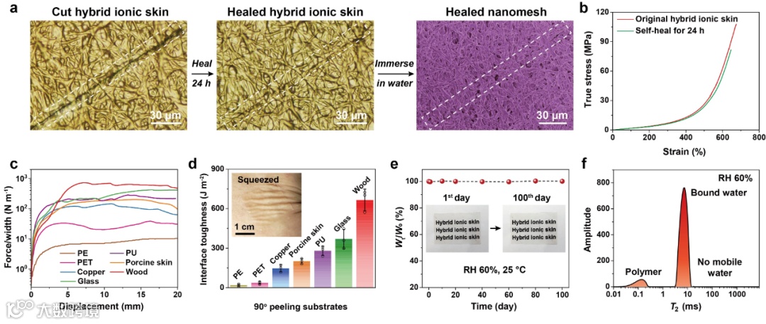图3. 复合离子皮肤的自修复性、粘附性及环境稳定性
