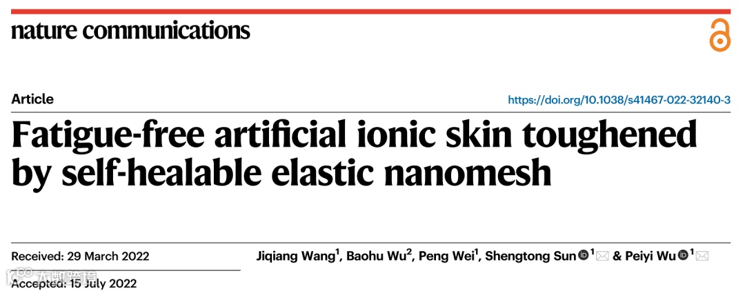 以上研究成果近期以“Fatigue-free artificial ionic skin toughened by self-healable elastic nanomesh”为题,发表在《Nature Communications》(Nat. Commun. 2022, 13, 4411)上。东华大学化学与化工学院博士研究生王继强为论文第一作者,武培怡教授和孙胜童研究员为论文共同通讯作者。