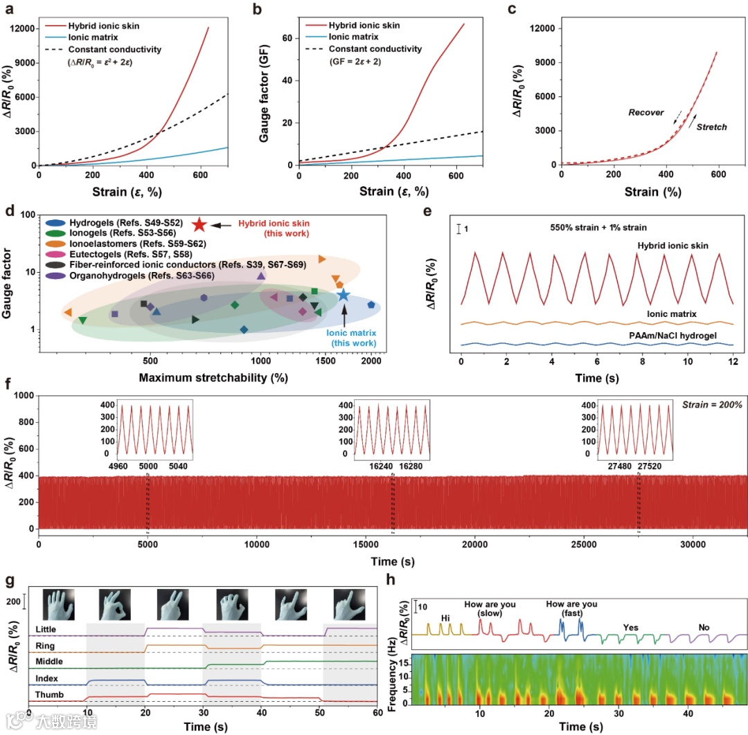 作者进一步考察了复合离子皮肤的可拉伸感知能力。与纯离子导体基质和恒电导率导体(如离子液体、液态金属)相比,复合离子皮肤表现出更高的电阻响应。630%应变下电阻响应灵敏度(GF)高达66.8,远远超过以往报道的本征可拉伸离子导体材料。这一高灵敏度使得复合离子皮肤对微小应变表现出极高的电学响应,在手势识别、语音识别、电生理信号采集等领域均有着较高的应用潜力。