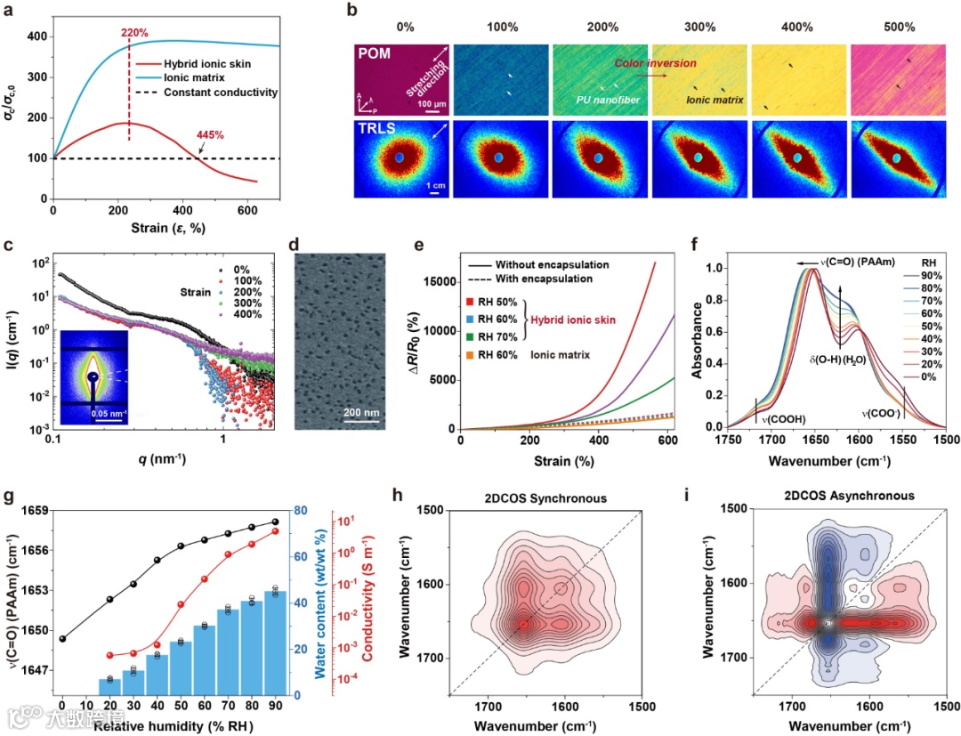 作者进一步利用对比分析、偏光显微分析、光散射、二维相关红外光谱、分子动力学模拟等多尺度表征技术探究了复合离子皮肤高应变感知灵敏度的原因。分析表明,其应变感知增强机制归因于纳米纤维网与离子基质的相互影响。纳米纤维网拉伸产生的内部挤压应力迫使吸湿性离子导电基质发生一定程度的水脱附(此过程可逆),从而降低了材料的离子电导率。在分子水平上,离子导电基质脱水主要受高湿度敏感的Ca2+:COO-络合相互作用驱动,继而影响了载流子Cl-的电荷扩散效率。