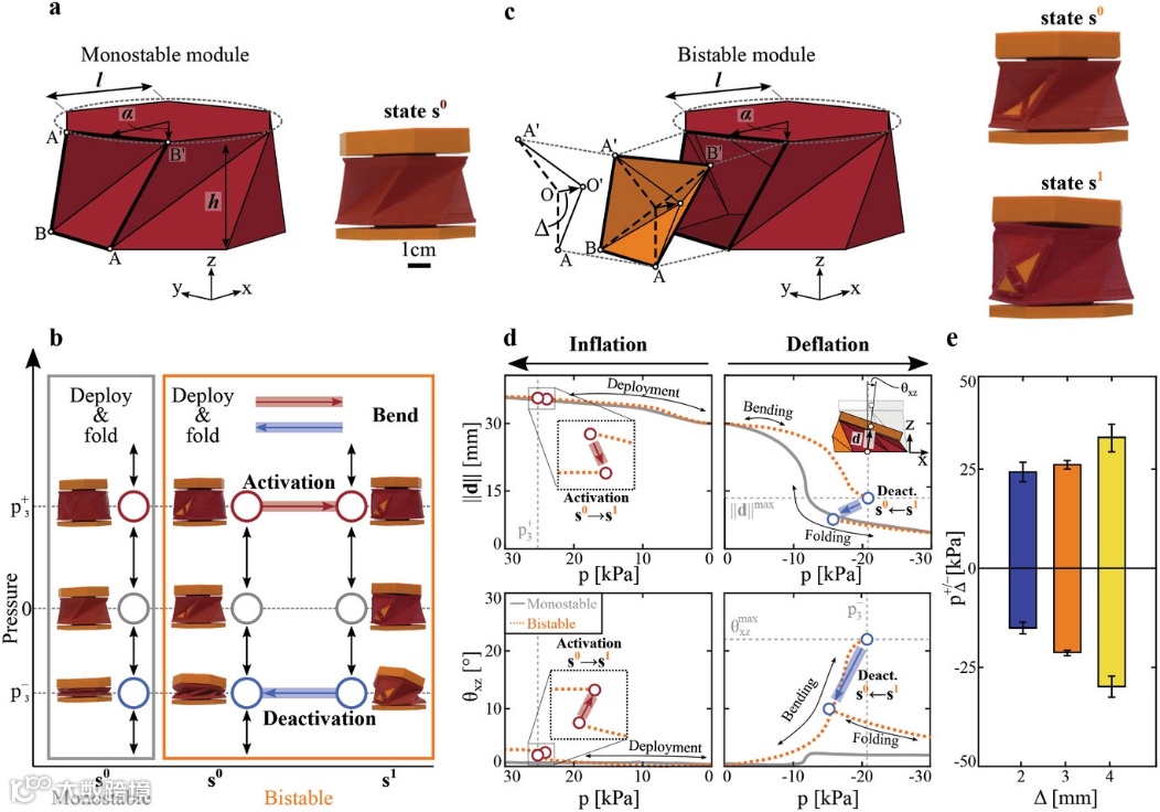 安全的人机交互是至关重要的,智能设备和机器人系统的设计通常依赖于充气和圆柱形结构,因为它们支持各种可能的变形。然而,其中绝大多数都存在输入压力和输出变形之间的内在一对一关系。换句话说,它们表现出随压力增加的单一变形。为了弥补这一缺陷,常见的策略包括对多个单元进行排序或单独对腔体加压。也可以利用材料的不可延展性和非线性来实现双向弯曲。尽管如此,以单一压力输入为目标的任意变形模式超出了当前充气系统的能力。在更广泛的自适应系统领域,折纸原理已被广泛用于实现可变形结构、自折叠机器和波导。分布式驱动方法已被用于直接通过压缩气囊或刺激响应材料控制折叠角度。然而,这些策略需要多个输入源,并导致体积庞大的组件,过度束缚或驱动缓慢。为了克服这些限制,最近的努力已经通过远程磁场实现了嵌入铁磁元件的折纸结构的形状控制。此外,折纸折痕显示非凸的能量景观,则会出现多个稳态,这可以扩展结构的功能。